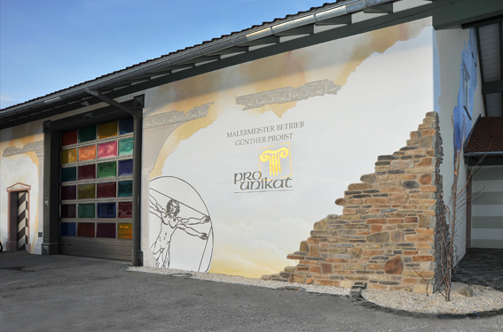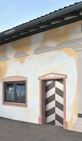 Um einer Fassade ein einzigartiges, individuelles Erscheinungsbild zu verleihen, kann mit diversen Farbanstrichen in verschiedenen Farbtönen und Lasuren eine künstlerische Fassadengestaltung entstehen. Häufig können Fassaden mit speziellen Motiven verziert werden, die in verschiedenartigen Oberflächentechniken angefertigt werden. Oder z.B. Farbakzente um Fenster und Türen.